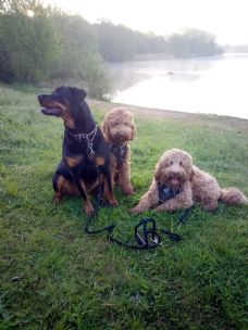 My partner walks our dogs every morning and evening for around 1 hour each walk around our local parks and Babbs mill lake. We always walk with the pets on their leash. We do however hire a dog friendly field out just for us and our boarders twice a week for off leash walks where they can explore and have lots of fun chasing one another.