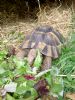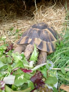 In warm weather tortoises will be put out into our 9ft x 6ft secure tortoise enclosure to bask in the sunshine and nibble some weeds. There is also a house to hide under.