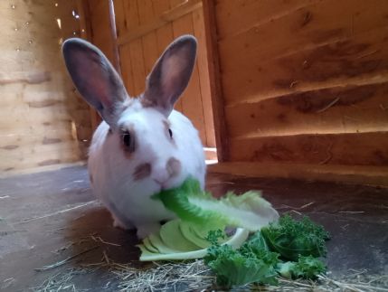 Rabbits will stay in one of our pet sheds with approximately 6ft x 8ft of indoor space and 9ft x 8ft of outside space, giving them constant access to an area greater than the 3m x 2m x 1m required for rabbits. There is a hutch for sleeping, a litter tray, food bowl, water bottle and a rack of fresh hay.
