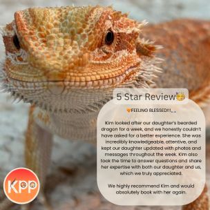 Kim is the best pet sitter I've had! She is an amazing communicator, promptly answering my messages and sending me picture updates of my bearded dragon everyday. Kim ensured everything from bask temperature, to food, to interior decor was perfect for my beardie.