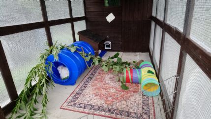 My two rabbits bumble and bear stayed with Trudi for 16 days, they looked like they had the best time, plenty of enrichment, toys, tunnels/ hides etc to keep them busy. She sent regular updates with how they were getting on which was a mind ease especially being abroad and worrying about them. They didn't want to leave when I picked them up :) they had plenty of space to run around and explore, very happy will 100% use hop a lot again :)