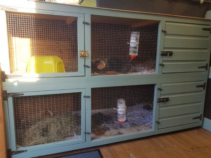 Rabbits are housed in a spacious 9 foot by 2.6 foot hutch (suite) inside our purpose-built rabbit lodge. Guinea pigs might also be housed in one of our suites or in a generous-sized 'indoor-type' guinea pig cage when busy.