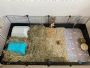 For Rabbits we have a 6x4 ft shed with 6x4 ft run attached. The run is made with 16 gauge wire and is fully secure. No rabbits are ever confined to small hutches. The shed is furnished with a large litter tray, hidey house and lots of enrichment to keep them busy.