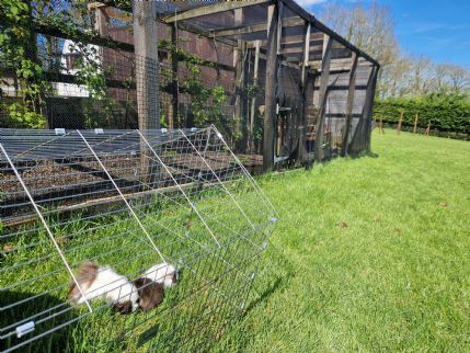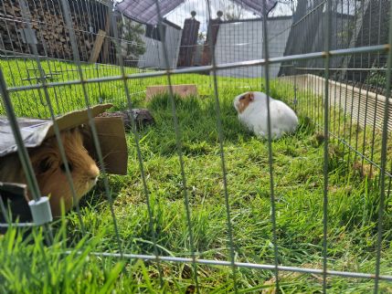We have enclosed outdoor runs for the warmer months. Guinea pigs will all get exercise outside every day weather permitting. All animals will get enrichment activities, and cuddles and attention – if they want it!